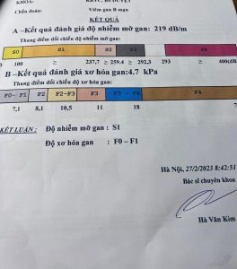 BS siêu âm mô tả: kích thước bình thường, nhu mô cấu trúc không đều, gan phải có nốt tăng âm KT 5,5mm. Kết luận: Hình ảnh xơ gan